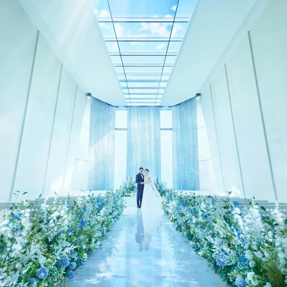 【天窓から自然光が降り注ぐ”光と水のチャペル”】天窓・祭壇の水のきらめきにより、光に包まれた空間に♪全天候型の大階段やフラワーシャワー、チャペルでの映像演出など、ゲストの皆様の記憶にも残る特別な一日を